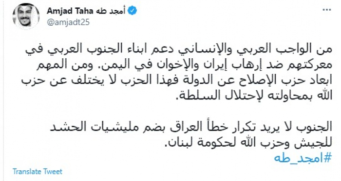 أمجد طه: يجب دعم أبناء الجنوب العربي ضد إرهاب إيران والإخوان