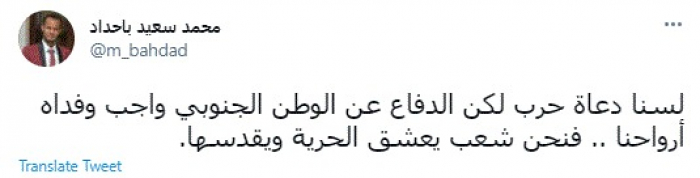 وكتب في تغريدة عبر "تويتر" رصدها "المشهد العربي": "لسنا دعاة حرب لكن الدفاع عن الوطن الجنوبي واجب وفداه أرواحنا.. فنحن شعب يعشق الحرية ويقدسها".
