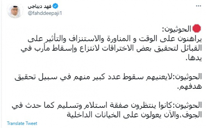 وكتب في تغريدة عبر "تويتر" رصدها "المشهد العربي": "الحوثيون: يراهنون على الوقت و المناورة والاستنزاف والتأثير على القبائل لتحقيق بعض الاختراقات لانتزاع وإسقاط مأرب في يدها".