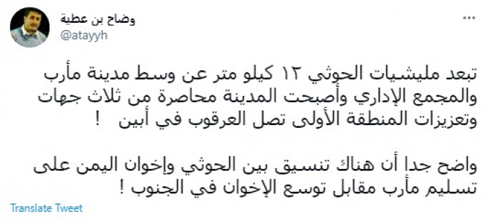 وكتب في تغريدة عبر "تويتر" رصدها "المشهد العربي": "تبعد مليشيات الحوثي 12 كيلو متر عن وسط مدينة مأرب والمجمع الإداري وأصبحت المدينة محاصرة من ثلاث جهات وتعزيزات المنطقة الأولى تصل العرقوب في أبين".