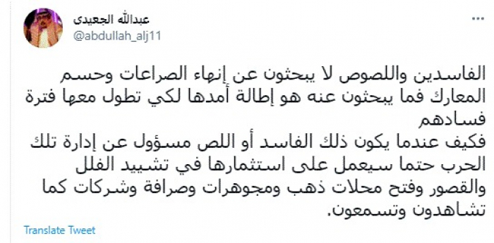 وكتب في تغريدة عبر "تويتر" رصدها "المشهد العربي": "الفاسدين واللصوص لا يبحثون عن إنهاء الصراعات وحسم المعارك فما يبحثون عنه هو إطالة أمدها لكي تطول معها فترة فسادهم".