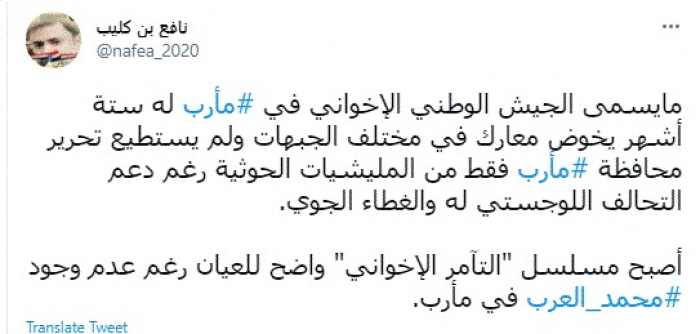 وكتب في تغريدة عبر "تويتر" رصدها "المشهد العربي": "ما يسمى الجيش الوطني الإخواني في مأرب له ستة أشهر يخوض معارك في مختلف الجبهات ولم يستطيع تحرير محافظة مأرب فقط من المليشيات الحوثية رغم دعم التحالف اللوجستي له والغطاء الجوي".