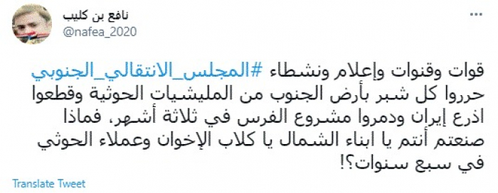 وقال في تغريدة عبر "تويتر" رصدها "المشهد العربي": "قوات وقنوات وإعلام ونشطاء المجلس الانتقالي الجنوبي حرروا كل شبر بأرض الجنوب من المليشيات الحوثية وقطعوا أذرع إيران ودمروا مشروع الفرس في ثلاثة أشهر، فماذا صنعتم أنتم يا أبناء الشمال يا ... الإخوان و.... الحوثي في سبع سنوات".