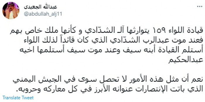 هاجم الشاعر عبدالله الجعيدي، اليوم، ما يسمى بالجيش اليمني بسبب توريت قيادة اللواء 159 لـ آل الشدادي.