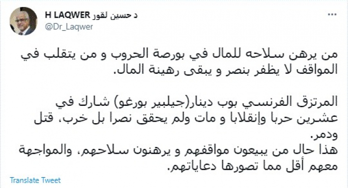 وكتب في تغريدة عبر "تويتر" رصدها "المشهد العربي": "من يرهن سلاحه للمال في بورصة الحروب ومن يتقلب في المواقف لا يظفر بنصر ويبقى رهينة المال".