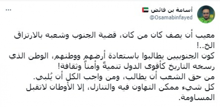 وقال في تغريدة على حسابه بموقع التدوين المصغر تويتر، اليوم إنه: "معيب أن يصف كان من كان، قضية الجنوب وشعبه بالارتزاق إلخ..!".