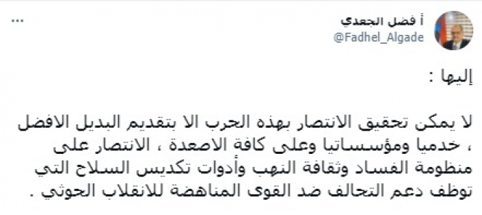 ونبه في تغريدة على حسابه بموقع التدوين المصغر تويتر، اليوم إلى أنه: "لا يمكن تحقيق الانتصار بهذه الحرب إلا بتقديم البديل الأفضل، خدميا ومؤسساتيا وعلى كافة الأصعدة".