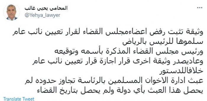 وكتب في تغريدة عبر "تويتر" رصدها "المشهد العربي": "وثيقة تثبت رفض أعضاء مجلس القضاء لقرار تعيين نائب عام سلموها للرئيس بالرياض، ورئيس مجلس القضاء المذكرة بأسمه وتوقيعه".