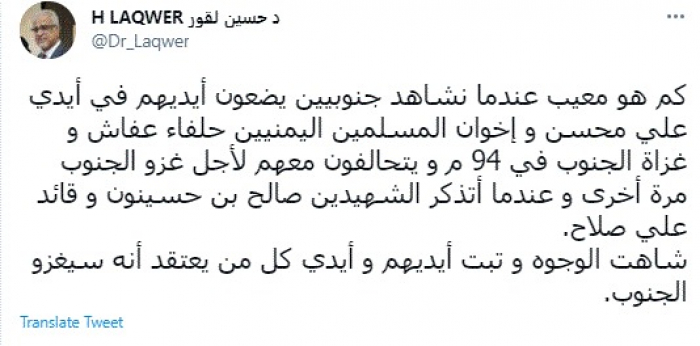 وقال في تغريدة عبر "تويتر" رصدها "المشهد العربي": "كم هو معيب عندما نشاهد جنوبيين يضعون أيديهم في أيدي علي محسن وإخوان المسلمين اليمنيين حلفاء عفاش وغزاة الجنوب في 94 م ويتحالفون معهم لأجل غزو الجنوب مرة أخرى وعندما أتذكر الشهيدين صالح بن حسينون وقائد علي صلاح".