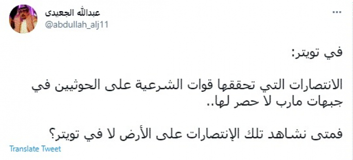 وقال في تغريدة عبر "تويتر" رصدها "المشهد العربي": "في تويتر: الانتصارات التي تحققها قوات الشرعية على الحوثيين في جبهات مأرب لا حصر لها".