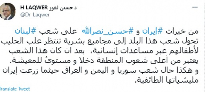 وكتب في تغريدة عبر "تويتر" رصدها "المشهد العربي": "من خيرات إيران وحسن نصرالله على شعب لبنان تحول شعب هذا البلد إلى مجاميع بشرية تنتظر علب الحليب لأطفالهم عبر مساعدات إنسانية، بعد أن كان هذا الشعب يعتبر من أعلى شعوب المنطقة دخلا ومستوى للمعيشة".