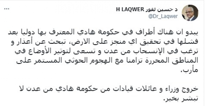 وقال في تغريدة على حسابه بموقع التدوين المصغر تويتر، اليوم إنه: "يبدو أن هناك أطرافا في حكومة هادي بعد فشلها في تحقيق أي منجز على الأرض، تبحث عن أعذار وترغب في الانسحاب من عدن وتسعى لتوتير الأوضاع في المناطق المحررة تزامنا مع الهجوم الحوثي المستمر على مأرب".