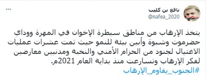 وتابع: "حيث تمت عشرات عمليات الاغتيال لجنود من الحزام الأمني والنخبة ومدنيين معارضين لفكر الإرهاب وتسارعت منذ بداية العام 2021م"، مختتما بهاشتاج: "الجنوب يقاوم الإرهاب".
