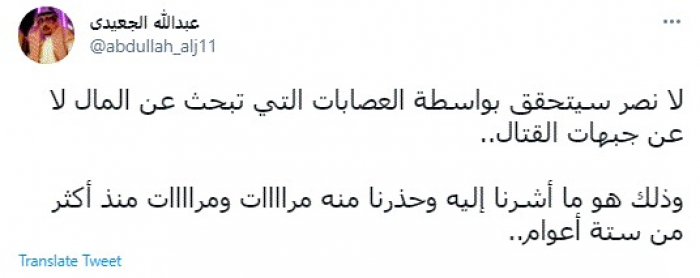 قال الشاعر عبدالله الجعيدي، اليوم، إن النصر لن يتحقق بواسطة العصابات التي تبحث عن المال.