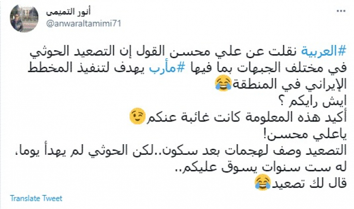 وقال في تغريدة عبر "تويتر" رصدها "المشهد العربي": "العربية نقلت عن علي محسن القول إن التصعيد الحوثي في مختلف الجبهات بما فيها مأرب يهدف لتنفيذ المخطط الإيراني في المنطقة.. ايش رأيكم؟ أكيد هذه المعلومة كانت غائبة عنكم".