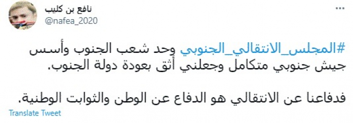 وكتب في تغريدة عبر "تويتر" رصدها "المشهد العربي": "المجلس الانتقالي الجنوبي وحد شعب الجنوب وأسس جيش جنوبي متكامل وجعلني أثق بعودة دولة الجنوب".