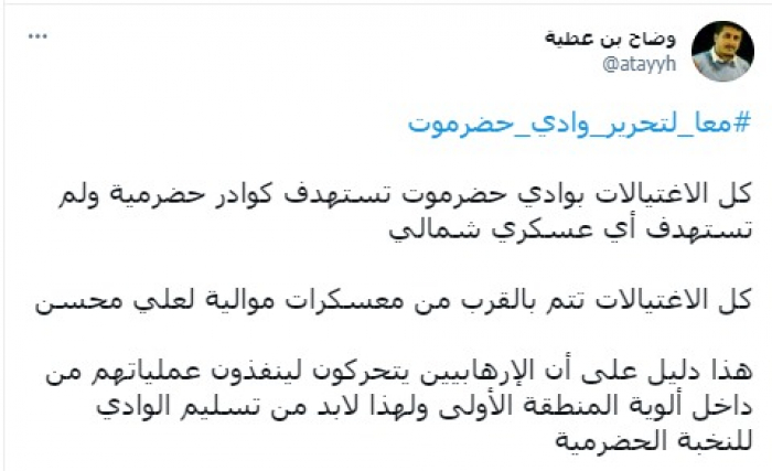 ولفت إلى أن: "كل الاغتيالات بوادي حضرموت تستهدف كوادر حضرمية ولم تستهدف أي عسكري شمالي".