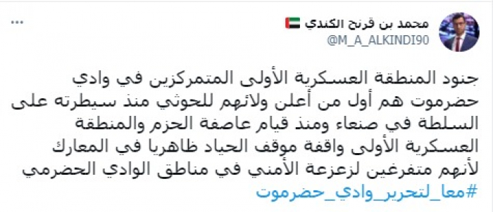 وأشار في تغريدة على حسابه بموقع التدوين المصغر تويتر، اليوم إلى أن: "جنود المنطقة العسكرية الأولى المتمركزين في وادي حضرموت هم أول من أعلن ولاءهم للحوثي منذ سيطرته على السلطة في صنعاء".