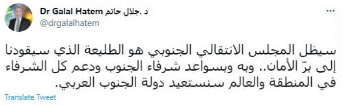 وكتب في تغريدة عبر "تويتر" رصدها "المشهد العربي": "سيظل المجلس الانتقالي الجنوبي هو الطليعة الذي سيقودنا إلى برّ الأمان.. وبه وبسواعد شرفاء الجنوب ودعم كل الشرفاء في المنطقة والعالم سنستعيد دولة الجنوب العربي".
