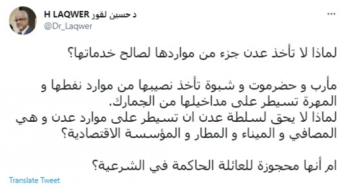 وقال في تغريدة عبر "تويتر" رصدها "المشهد العربي": "لماذا لا تأخذ عدن جزء من مواردها لصالح خدماتها؟".