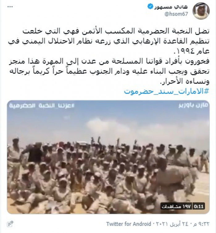 وكتب "مسهور" عبر تغريدة رصدها "المشهد العربي": "تظل النخبة الحضرمية المكسب الأثمن فهي التي خلعت تنظيم القاعدة الإرهابي الذي زرعه نظام الاحتلال اليمني في عام ١٩٩٤".
