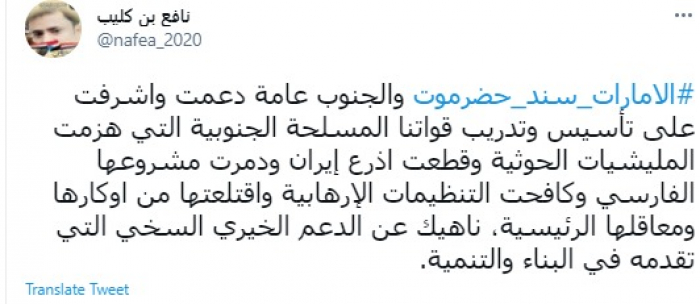 وكتب في تغريدة عبر "تويتر" رصدها "المشهد العربي": "الإمارات سند حضرموت والجنوب عامة دعمت وأشرفت على تأسيس وتدريب قواتنا المسلحة الجنوبية التي هزمت المليشيات الحوثية وقطعت أذرع إيران ودمرت مشروعها الفارسي وكافحت التنظيمات الإرهابية واقتلعتها من أوكارها ومعاقلها الرئيسية".