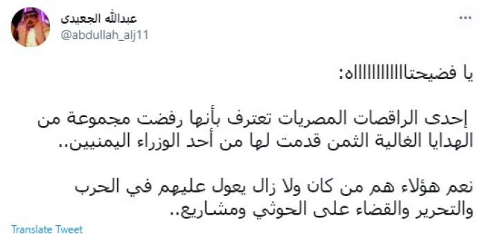 وقال في تغريدة عبر "تويتر" رصدها "المشهد العربي": "يا فضيحتاه.. إحدى الراقصات المصريات تعترف بأنها رفضت مجموعة من الهدايا الغالية الثمن قدمت لها من أحد الوزراء اليمنيين نعم هؤلاء هم من كان ولا زال يعول عليهم في الحرب والتحرير والقضاء على الحوثي ومشاريع".