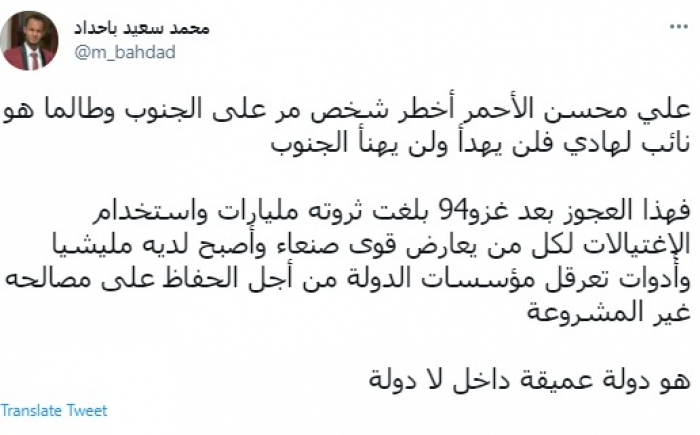 وكتب في تغريدة عبر "تويتر" رصدها "المشهد العربي": "علي محسن الأحمر أخطر شخص مر على الجنوب وطالما هو نائب لهادي فلن يهدأ ولن يهنأ الجنوب".