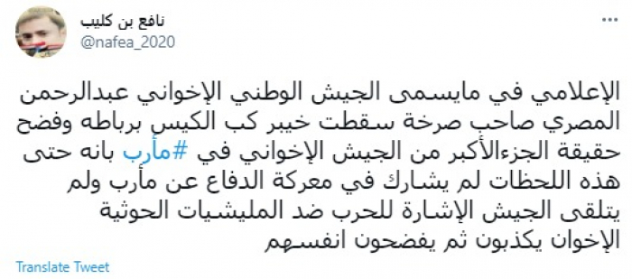وقال في تغريدة عبر "تويتر" رصدها "المشهد العربي": "الإعلامي في ما يسمى الجيش الوطني الإخواني عبدالرحمن المصري صاحب صرخة سقطت خيبر ... الكيس برباطه وفضح حقيقة الجزء الأكبر من الجيش الإخواني في مأرب بأنه حتى هذه اللحظات لم يشارك في معركة الدفاع عن مأرب ولم يتلقى الجيش الإشارة للحرب ضد المليشيات الحوثية".