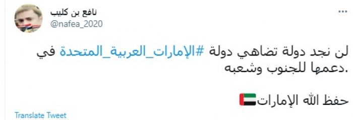 وقال في تغريدة عبر "تويتر" رصدها "المشهد العربي": "لن نجد دولة تضاهي دولة الإمارات العربية المتحدة في دعمها للجنوب وشعبه".