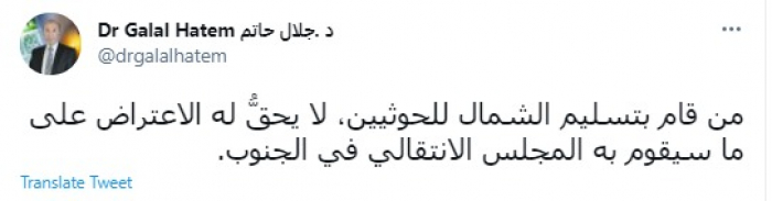 حاتم: من قام بتسليم الشمال للحوثي لا يحقُّ له الاعتراض على ما سيقوم به الانتقالي بالجنوب