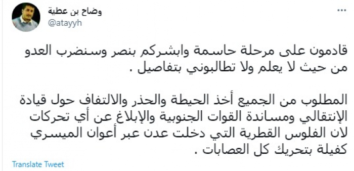 وأضاف: "المطلوب من الجميع أخذ الحيطة والحذر والالتفاف حول قيادة الانتقالي ومساندة القوات الجنوبية والإبلاغ عن أي تحركات لأن الفلوس القطرية التي دخلت عدن عبر أعوان الميسري كفيلة بتحريك كل العصابات".