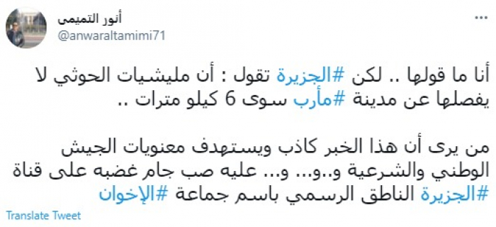 وقال في تغريدة عبر "تويتر" رصدها "المشهد العربي": "أنا ما قولها .. لكن الجزيرة تقول: أن مليشيات الحوثي لا يفصلها عن مدينة مأرب سوى 6 كيلو مترات".