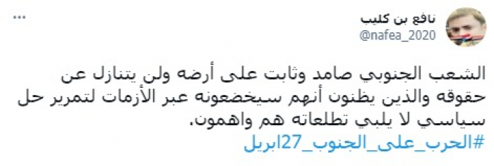 وأوضح أن: "الذين يظنون أنهم سيخضعونه عبر الأزمات لتمرير حل سياسي لا يلبي تطلعاته هم واهمون"، مختتما بهاشتاج: "الحرب على الجنوب 27 أبريل".