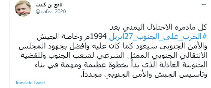وكتب في تغريدة عبر "تويتر" رصدها "المشهد العربي": "كل ما دمره الاحتلال اليمني بعد الحرب على الجنوب27 إبريل 1994م وخاصة الجيش والأمن الجنوبي سيعود كما كان عليه وأفضل بجهود المجلس الانتقالي الجنوبي الممثل الشرعي لشعب الجنوب وللقضية الجنوبية العادلة الذي بدأ بخطوة عظيمة ومهمة في بناء وتأسيس الجيش والأمن الجنوبي مجددًا".