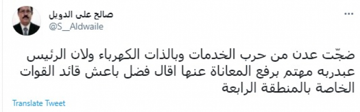 وقال في تغريدة عبر "تويتر" رصدها "المشهد العربي": "ضجّت عدن من حرب الخدمات وبالذات الكهرباء ولان الرئيس عبدربه مهتم برفع المعاناة عنها أقال فضل باعش قائد القوات الخاصة بالمنطقة الرابعة".