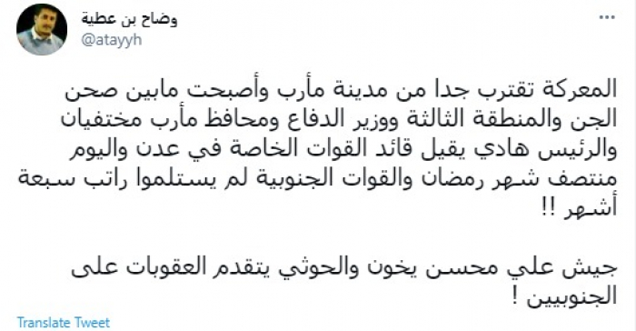وكتب في تغريدة عبر "تويتر" رصدها "المشهد العربي": "المعركة تقترب جدًا من مدينة مأرب وأصبحت ما بين صحن الجن والمنطقة الثالثة ووزير الدفاع ومحافظ مأرب مختفيان والرئيس هادي يقيل قائد القوات الخاصة في عدن واليوم منتصف شهر رمضان والقوات الجنوبية لم يستلموا راتب سبعة أشهر".