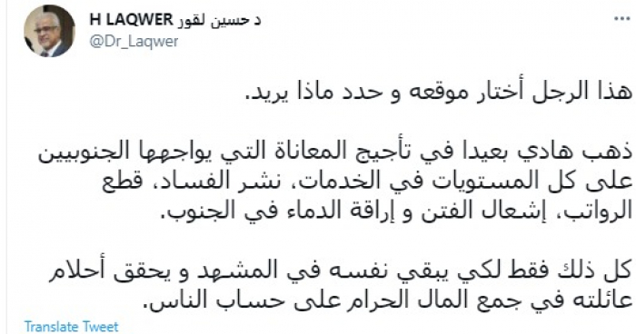 لقور مُهاجمًا هادي: حقق أحلام عائلته في جمع المال الحرام على حساب الناس