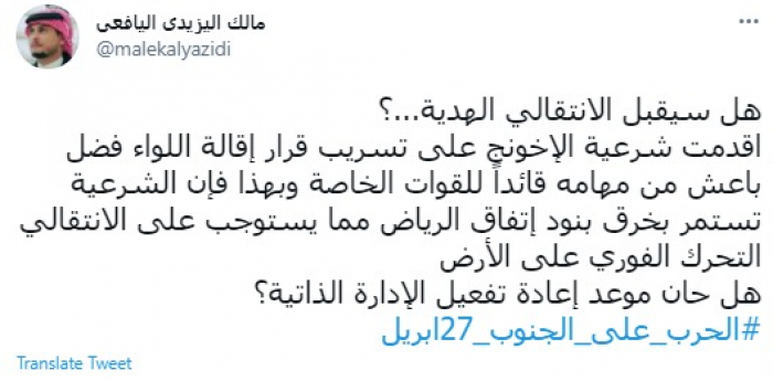 وأضاف: "اقدمت شرعية الإخونج على تسريب قرار إقالة اللواء فضل باعش من مهامه قائدًا للقوات الخاصة وبهذا فإن الشرعية تستمر بخرق بنود اتفاق الرياض مما يستوجب على الانتقالي التحرك الفوري على الأرض".