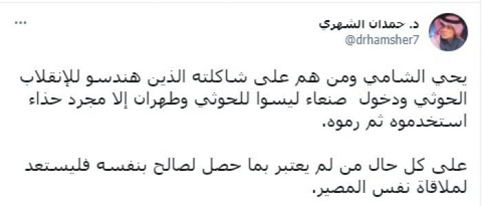 وأكد في تغريدة على حسابه بموقع التدوين المصغر تويتر، اليوم أن: "يحيى الشامي ومن هم على شاكلته الذين هندسوا للانقلاب الحوثي ودخول صنعاء ليسوا للحوثي وطهران إلا مجرد حذاء استخدموه ثم رموه".