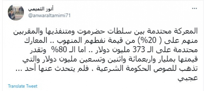 وكتب في تغريدة عبر "تويتر" رصدها "المشهد العربي": "المعركة محتدمة بين سلطات حضرموت ومتنفذيها والمقربين منهم على ( 20%) من قيمة نفطهم المنهوب .. المعارك محتدمة على الـ 373 مليون دولار".