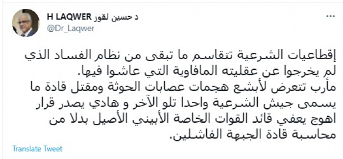 وقال في تغريدة عبر "تويتر" رصدها "المشهد العربي": "اقطاعيات الشرعية تتقاسم ما تبقى من نظام الفساد الذي لم يخرجوا عن عقليته المافاوية التي عاشوا فيها".