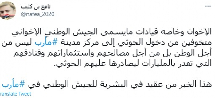 وقال في تغريدة عبر "تويتر" رصدها "المشهد العربي": "الإخوان وخاصة قيادات مايسمى الجيش الوطني الإخواني متخوفين من دخول الحوثي إلى مركز مدينة مأرب ليس من أجل الوطن بل من أجل مصالحهم واستثماراتهم وفنادقهم التي تقدر بالمليارات ليصادرها عليهم الحوثي".