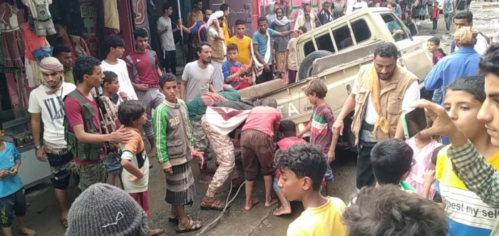 انزلقت سيارة دورية أمنية في حفرة خلفتها الأعمال الإنشائية لمشروع الصرف الصحي في جعار، بمحافظة أبين.