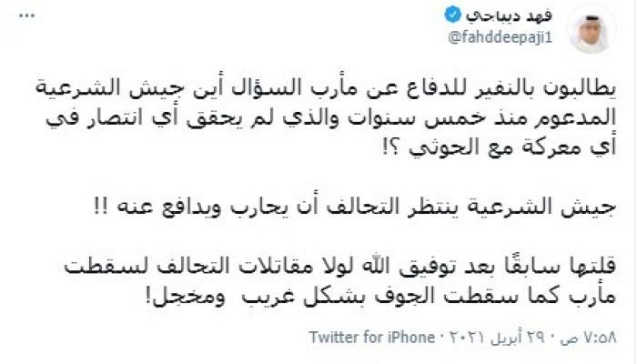 وكتب "ديباجي" تغريدة عبر تويتر، رصدها "المشهد العربي": "يطالبون بالنفير للدفاع عن مأرب السؤال أين جيش الشرعية المدعوم منذ خمس سنوات والذي لم يحقق أي انتصار في أي معركة مع الحوثي ؟".