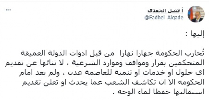 وأشار في تغريدة على حسابه بموقع التدوين المصغر تويتر، اليوم إلى أنه: "تُحارب الحكومة جهارا نهارا من قبل أدوات الدولة العميقة المتحكمين بقرار ومواقف وموارد الشرعية، لإثنائها عن تقديم أي حلول أو خدمات أو تنمية للعاصمة عدن".