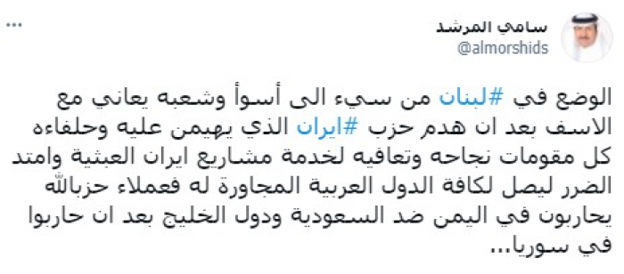 لفت المحلل السياسي السعودي سامي المرشد، إلى استمرار انزلاق الأوضاع في لبنان إلى الأسوأ، مضيفا أن عملاء مليشيات حزب الله الموالية لإيران يحاربون السعودية في اليمن.