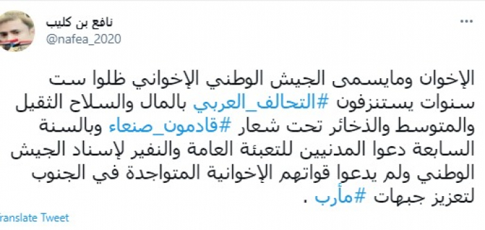 وكتب في تغريدة عبر "تويتر" رصدها "المشهد العربي": "الإخوان وما يسمى الجيش الوطني الإخواني ظلوا ست سنوات يستنزفون التحالف العربي بالمال والسلاح الثقيل والمتوسط والذخائر تحت شعار قادمون صنعاء".