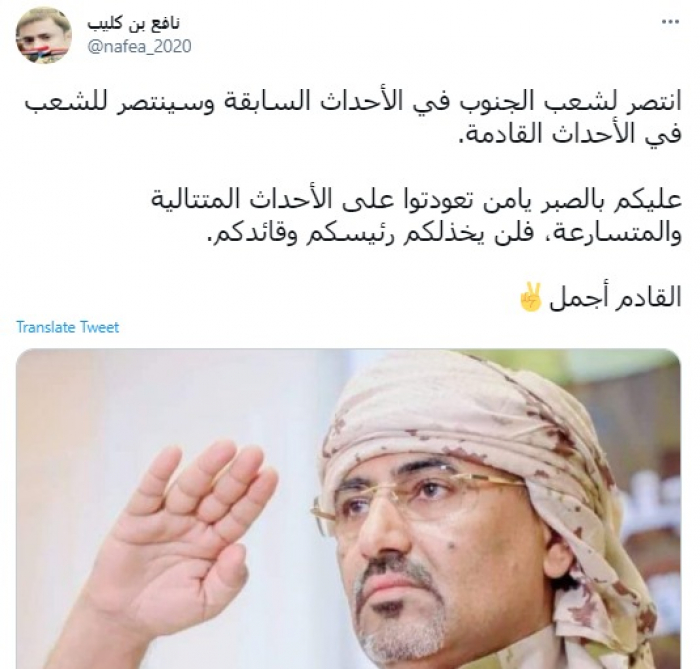 وكتب في تغريدة عبر "تويتر" رصدها "المشهد العربي": "انتصر لشعب الجنوب في الأحداث السابقة وسينتصر للشعب في الأحداث القادمة".