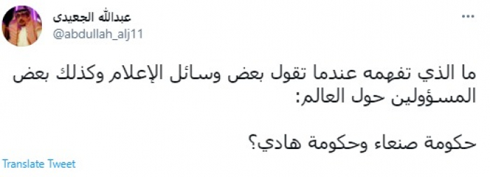 وقال في تغريدة عبر "تويتر" رصدها "المشهد العربي": "ما الذي تفهمه عندما تقول بعض وسائل الإعلام وكذلك بعض المسؤولين حول العالم: حكومة صنعاء وحكومة هادي؟".